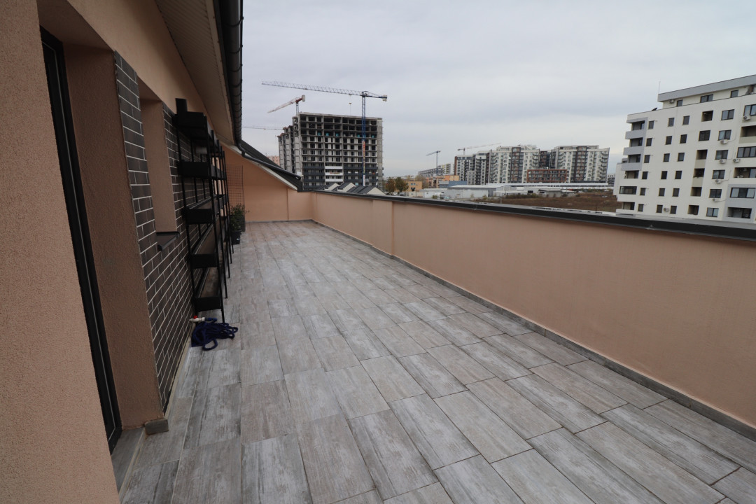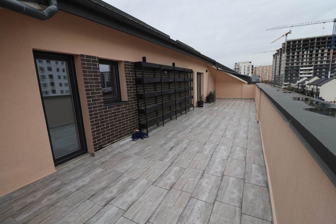 Terasa este descoperita in momentul de fata dar exista posibilitatea de a o inchide, transformand apartamentul in unul cu 3 sau 4 camere. Aproximativ 85% din suprafata apartamentului are un pod inalt deasupra, acesta putand fi compartimentat si folosit pentru depozitare sau locuinta, unii dintre vecinii de la ultimul etaj avand deja suprafata de pod delimitata.